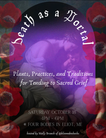 This workshop will offer a space to discuss death & the liminal space the spirit enters in between, rituals for the newly deceased, and cultural traditions surrounding death and mourning. We will focus on grief, including somatics of where it is felt and held in the body, how it impacts the brain, and which herbs and practices can be incorporated for supporting states of grief.